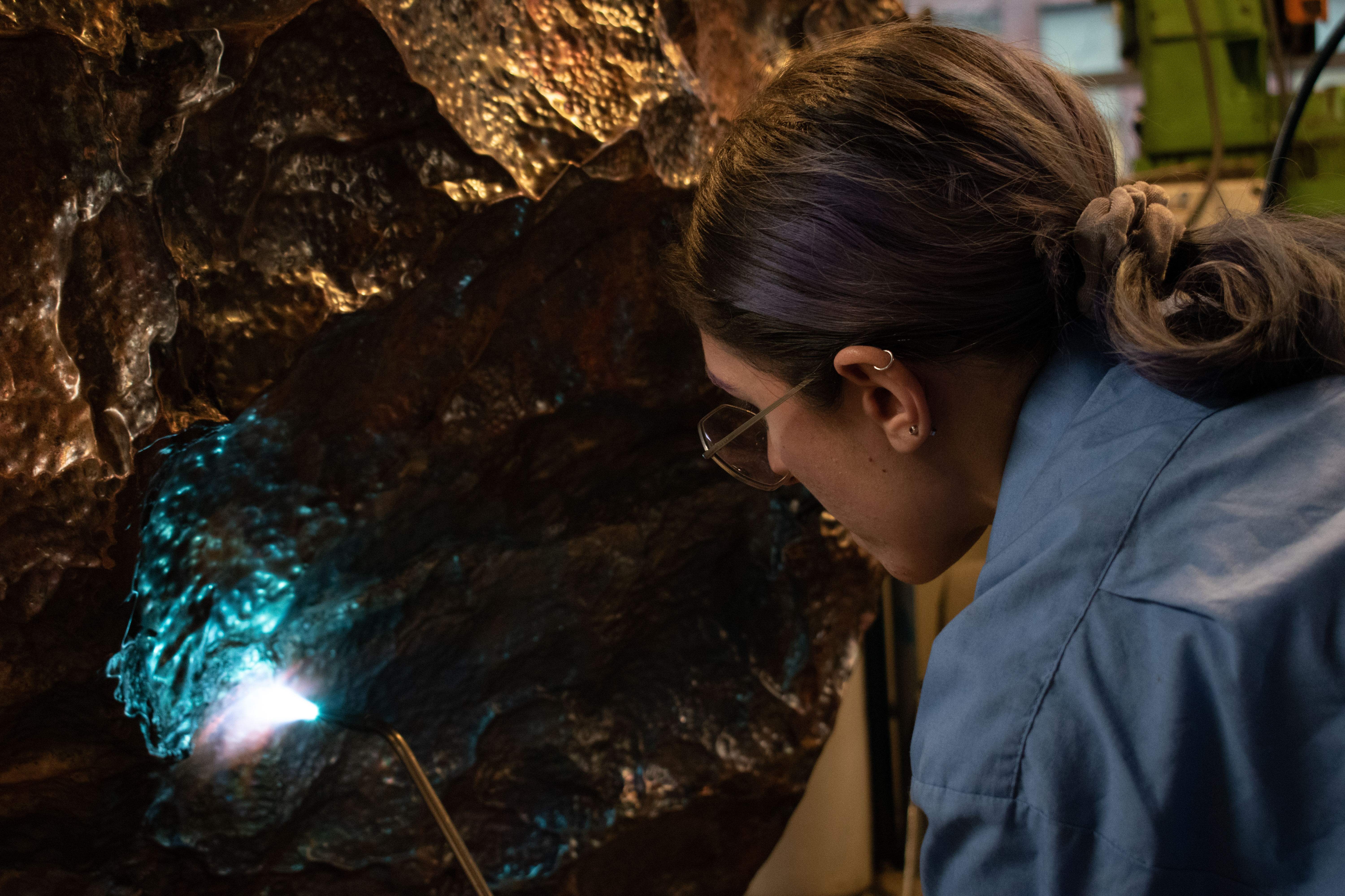 This object was created from sheets of copper, laid and hammered on rocks in the Bulgarian mountains in order to take the imprint of their texture. It is then moulded and blowtorched into shape, its irridescent surface bearing traces of its history.