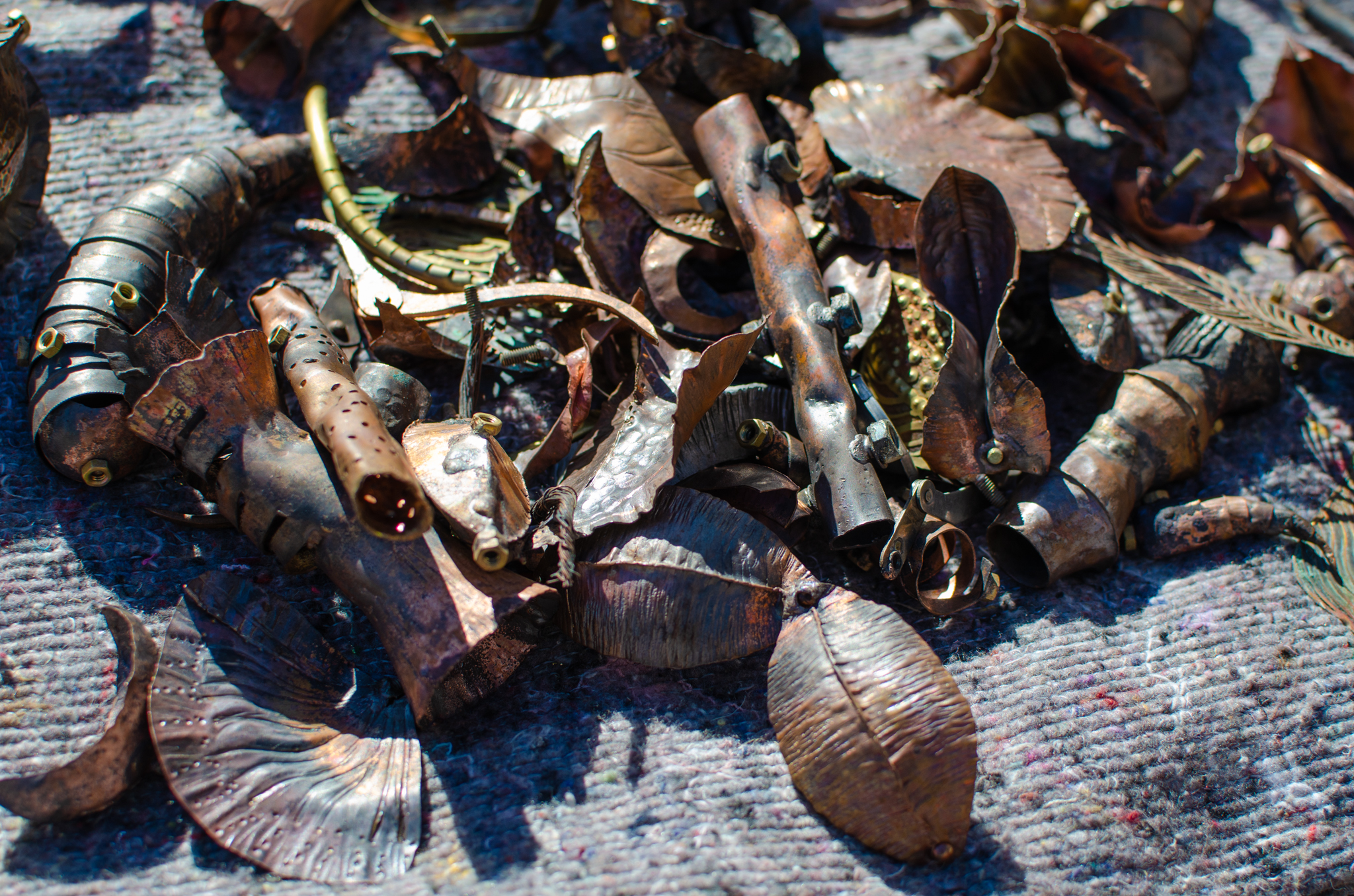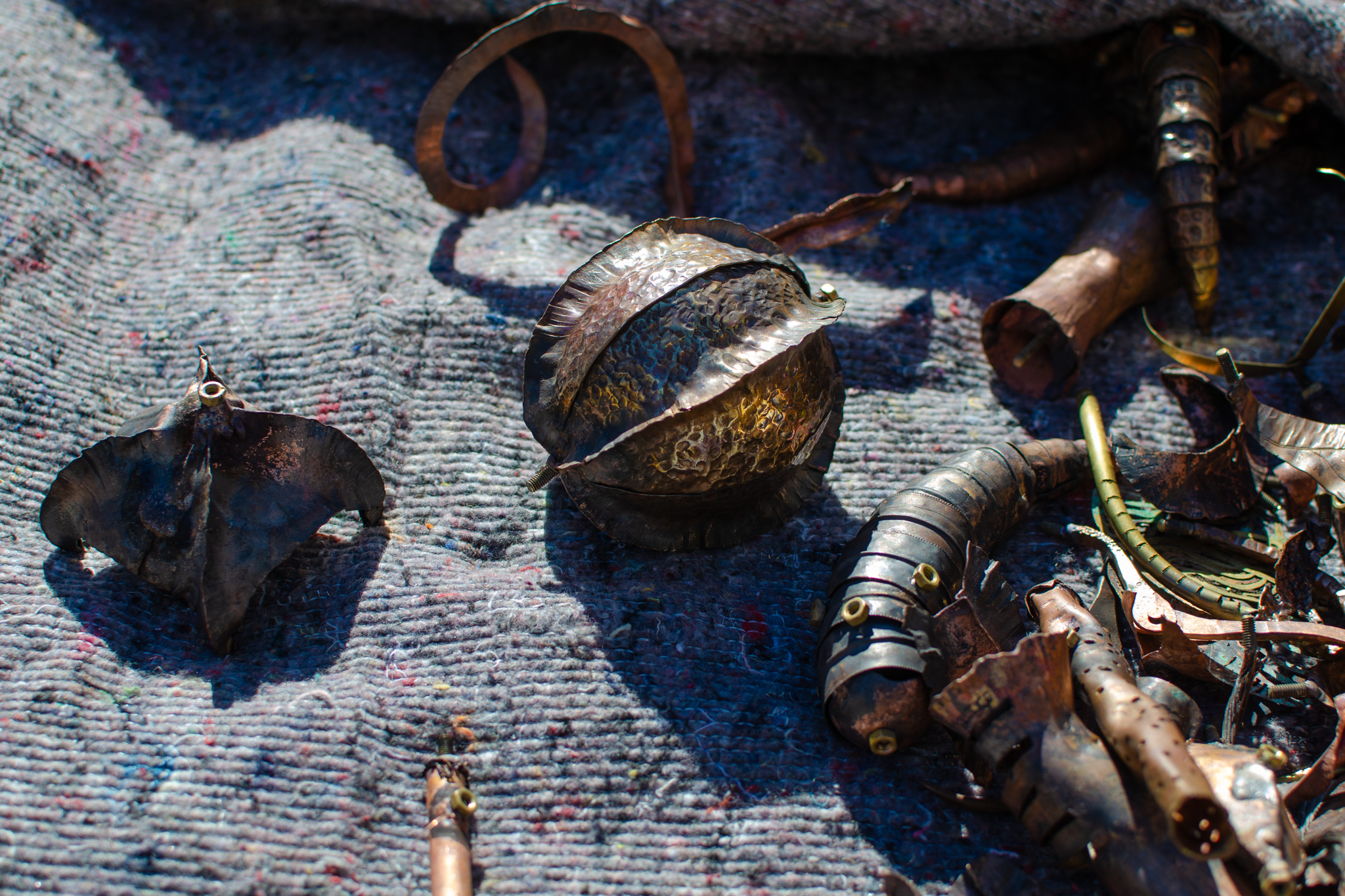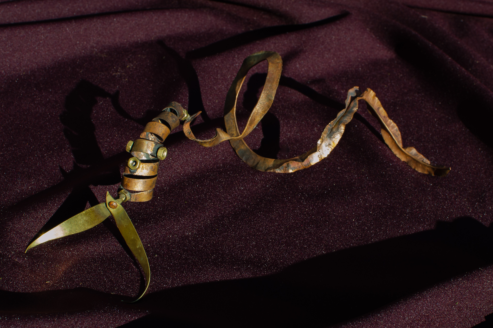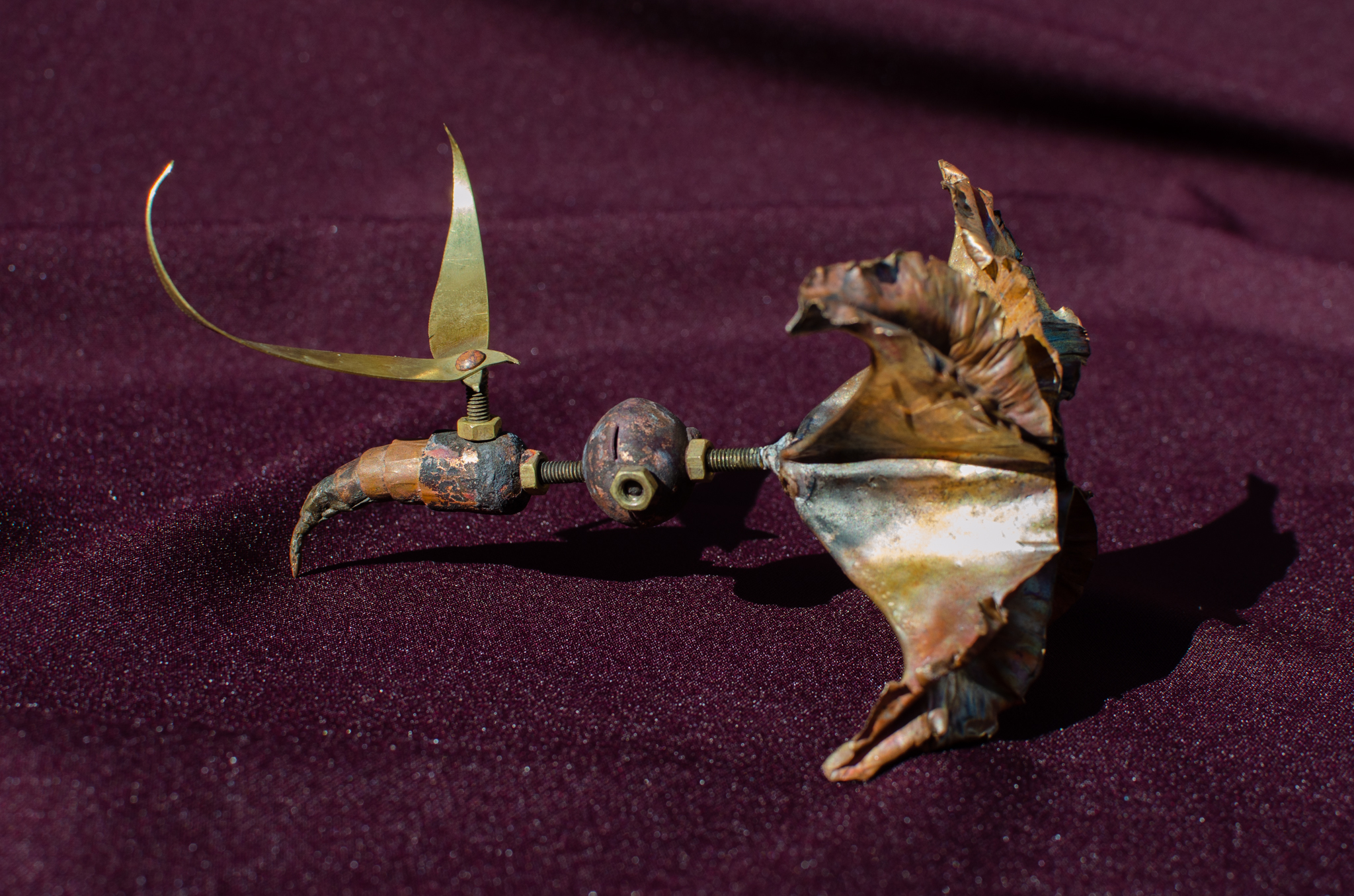 Since the disappearance of insect species, humans were forced to replace them with robots built in their image and likeness, intended to take over their vital functions. The insect scrapyard is a facility that allows people to choose from a collection of body parts and assemble their own insects, tailored to their needs—whether for pollination, air or water purification, pest control, and more. Nuts and bolts connect the wings, moveable limbs, dangerous stingers, and other pieces, all made of copper and brass.